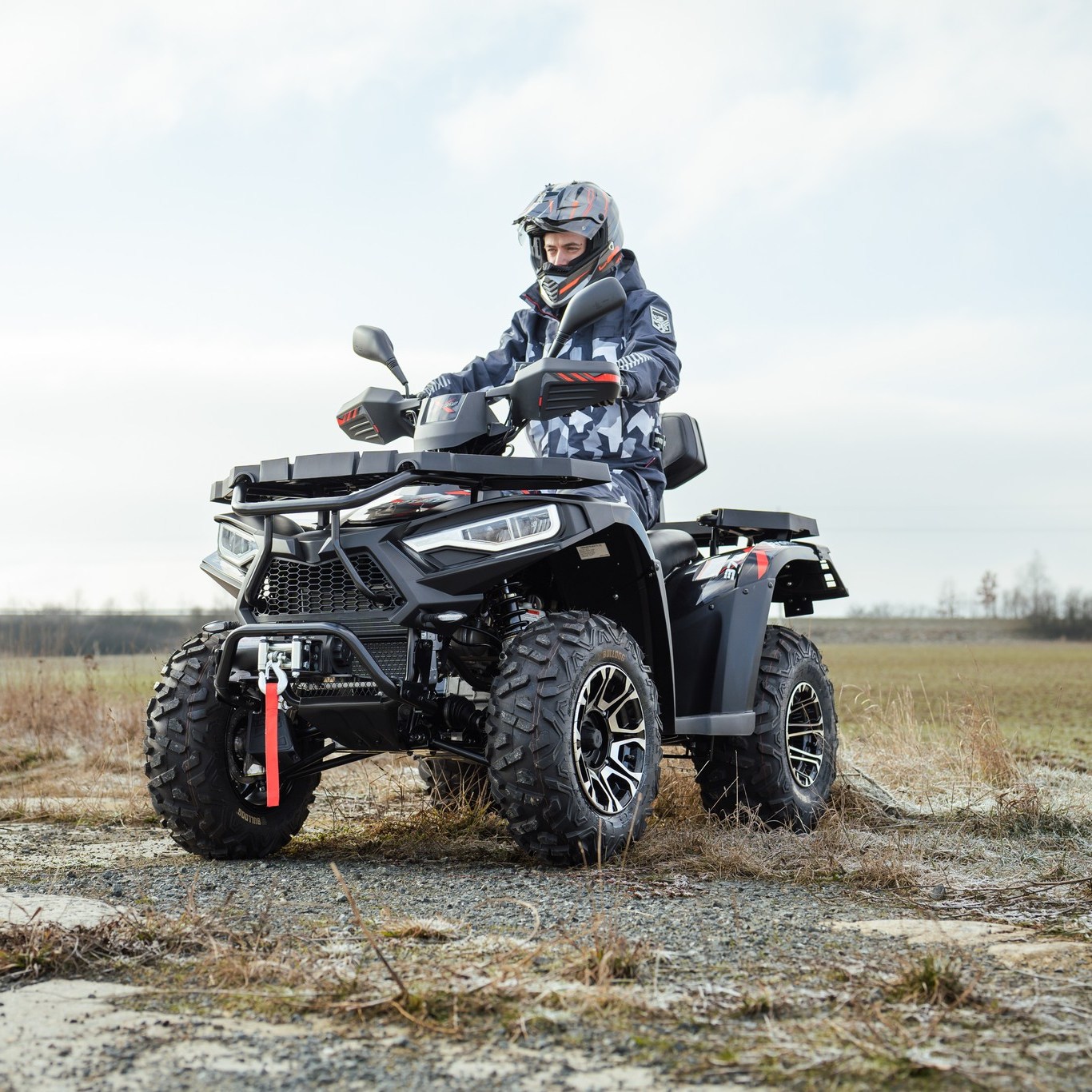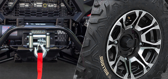 Elektricky přiřaditelný pohon 4x4, masivní přední ochranný rám, robustní přední a zadní nosič, ocelová kola se značkovými pneumatikami, elektrický naviják 3000lbs s dálkovým ovládáním, tažné zařízení, kryty páček a rukou, LED světla pro denní svícení, dvojité projektorové světlomety, zadní/brzdová/směrová světla s technologií LED, zadní opěrka.