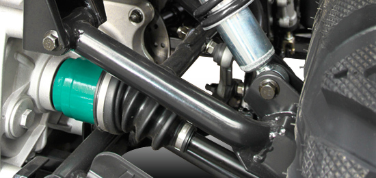 Široký, lehce ovladatelný podvozek s vysokými zdvihy pérování a nízkým těžištěm zajišťuje vysokou průchodnost v terénu a vynikající stabilitu při jízdě. Přední kola mají nezávislé zavěšení, výkonné kotoučové brzdy poskytují přesvědčivou brzdnou sílu. K vynikající obratnosti přispívá i velmi malý poloměr otáčení.