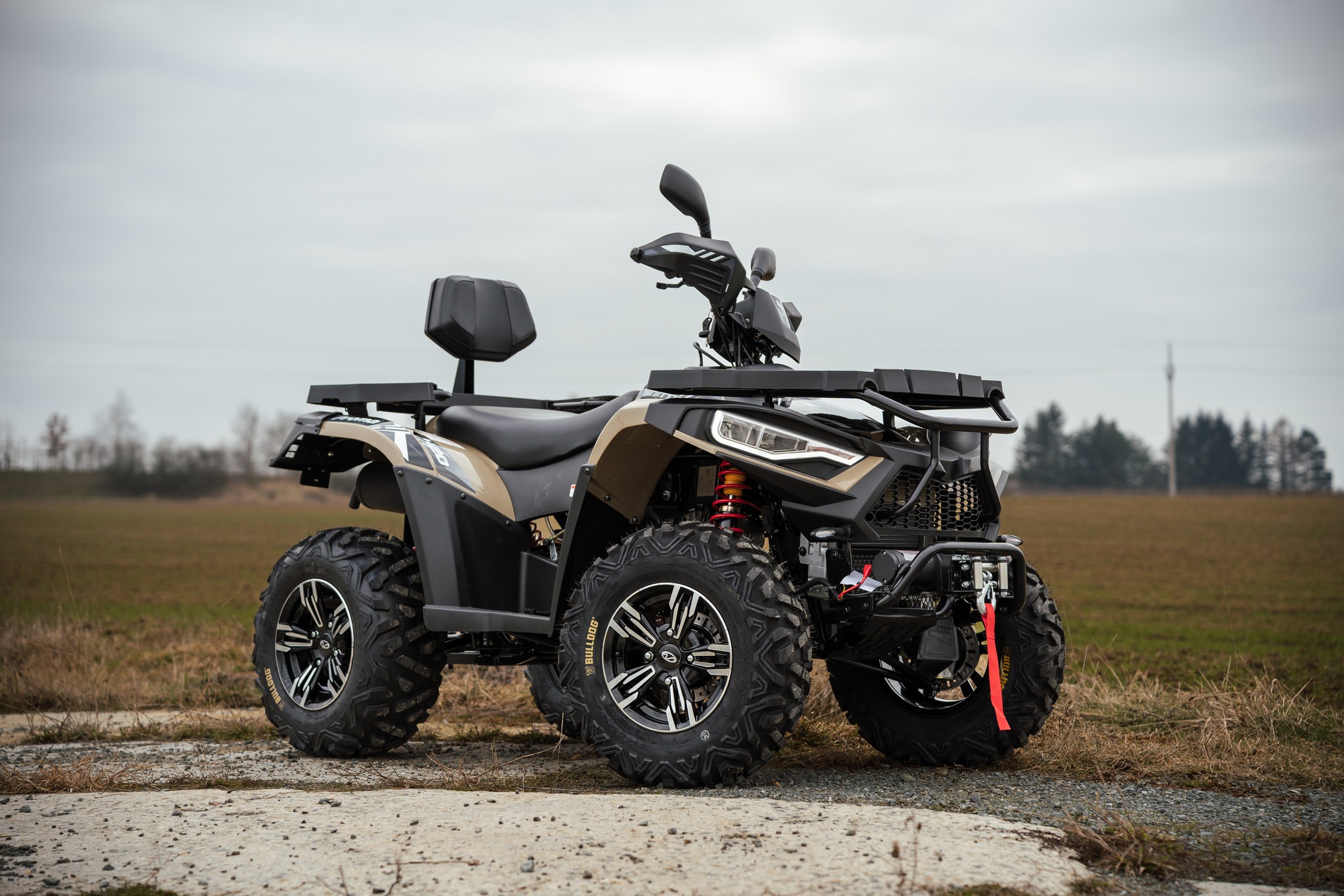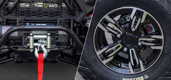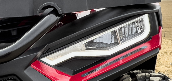 Elektricky přiřaditelný pohon 4x4, masivní přední ochranný rám, robustní přední a zadní nosič, designová litá alu kola se značkovými pneumatikami, elektrický naviják s tažnou silou 3000lbs a dálkovým ovládáním, tažné zařízení, kryty páček a rukou, LED Matrix světlomety, zadní/brzdová/směrová světla s technologií LED, akustická signalizace blikačů.