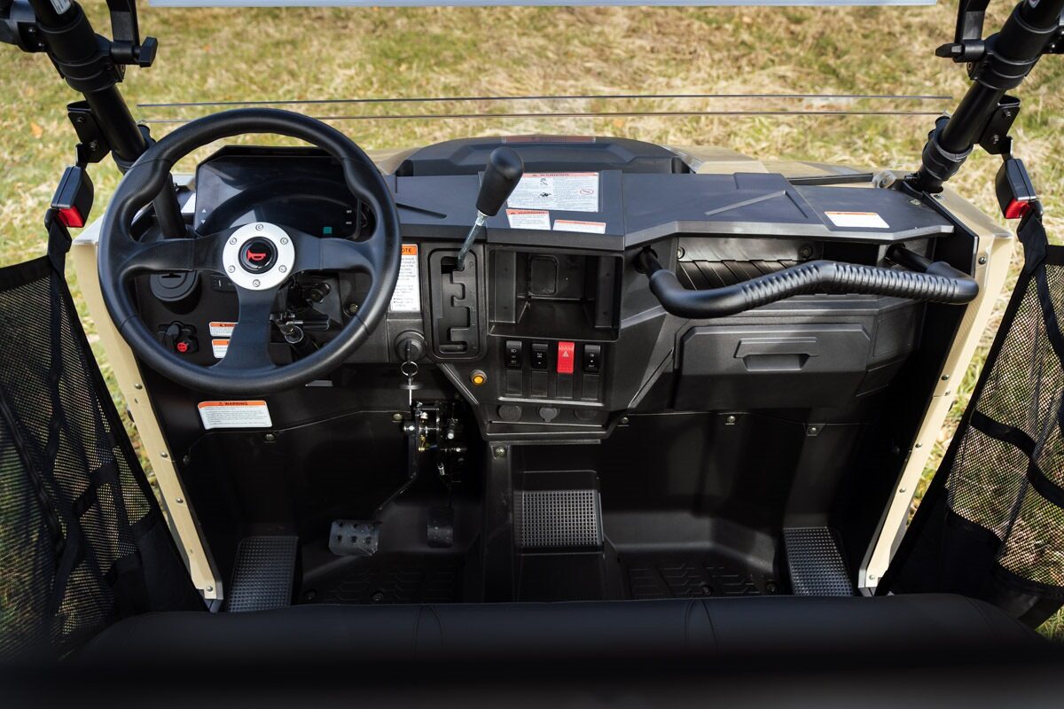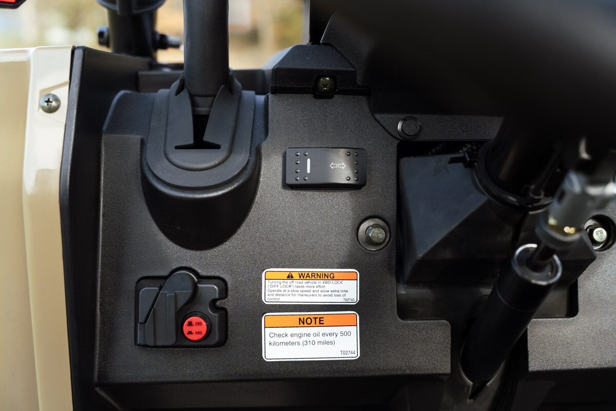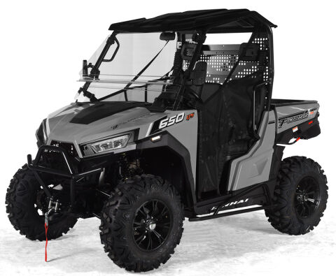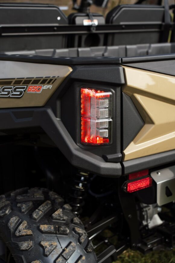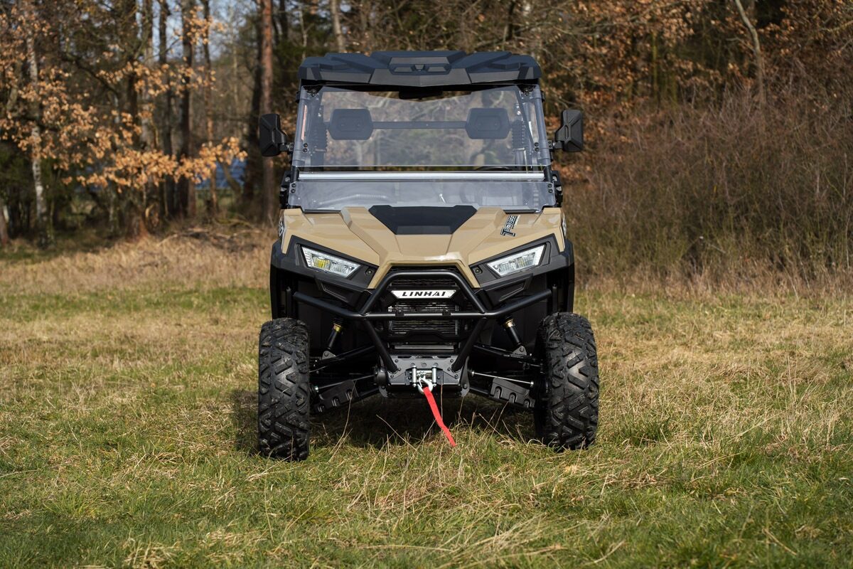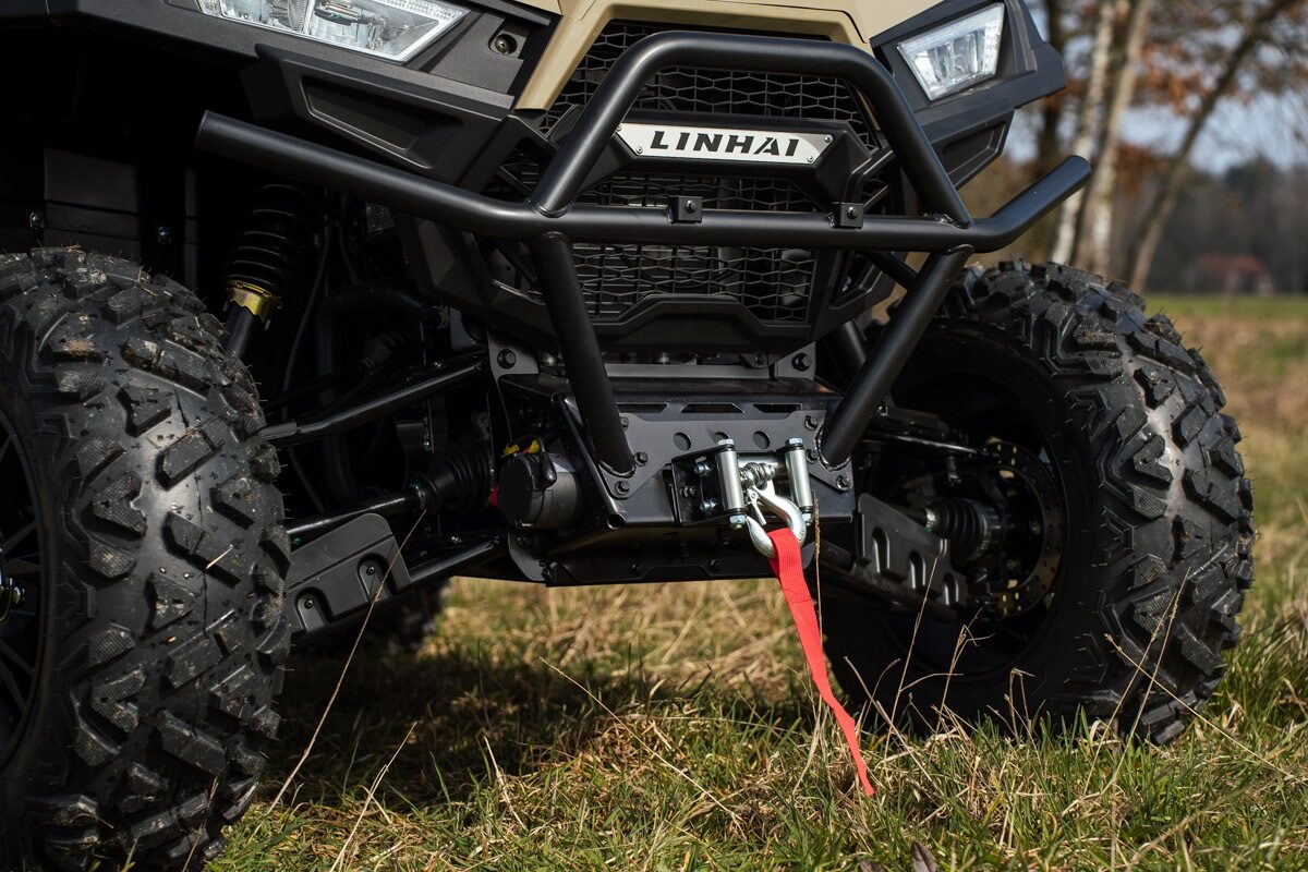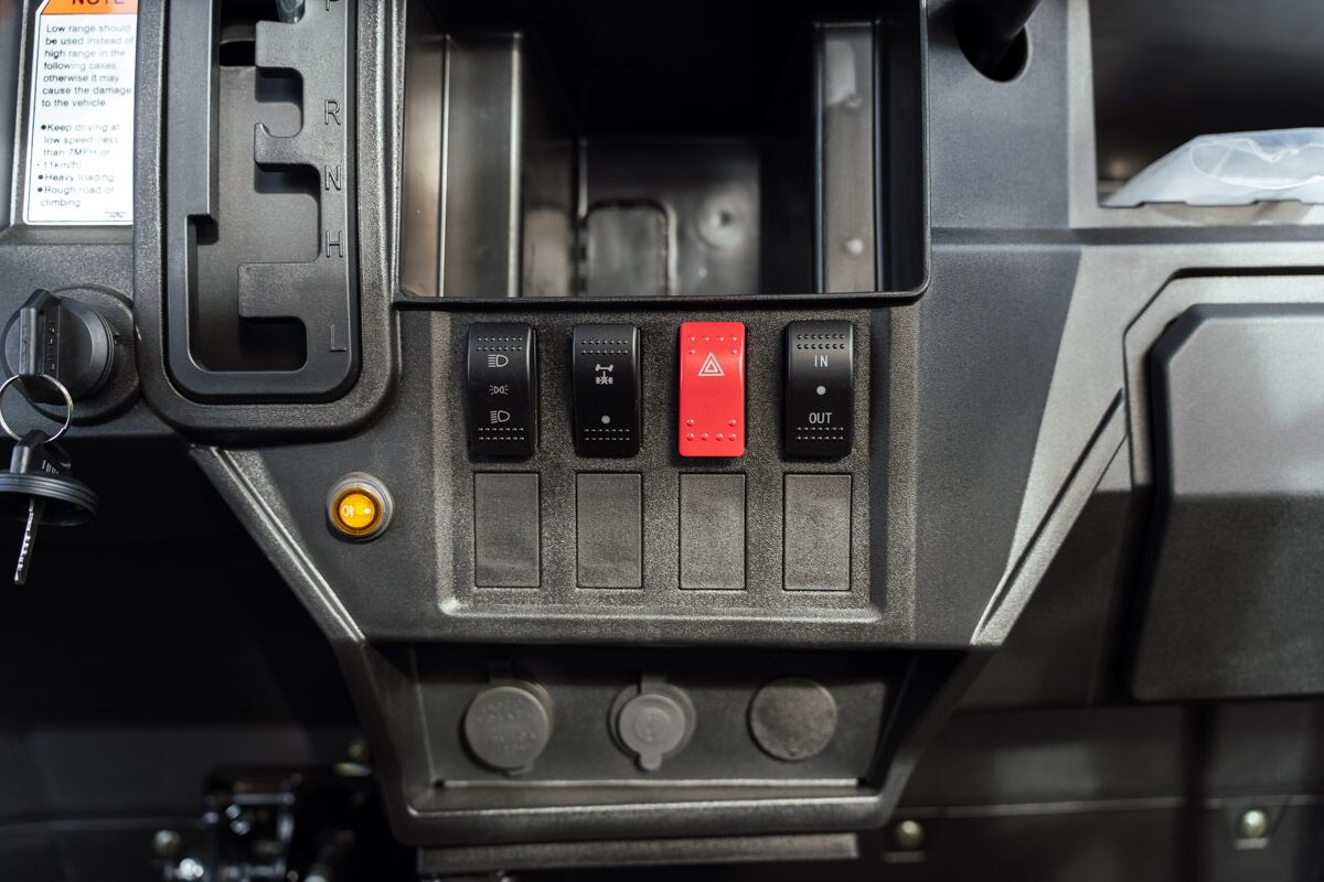 Elektrický posilovač řízení, pevná plastová střecha, plnohodnotné čelní plexi, přední ochranný rám, bezpečnostní sítě na straně řidiče i spolujezdce, madla pro spolujezdce, ocelová sklápěcí korba s plynovými vzpěrami, hlavové opěrky, tažné zařízení, elektrický naviják s tažnou silou a dálkovým ovládáním.