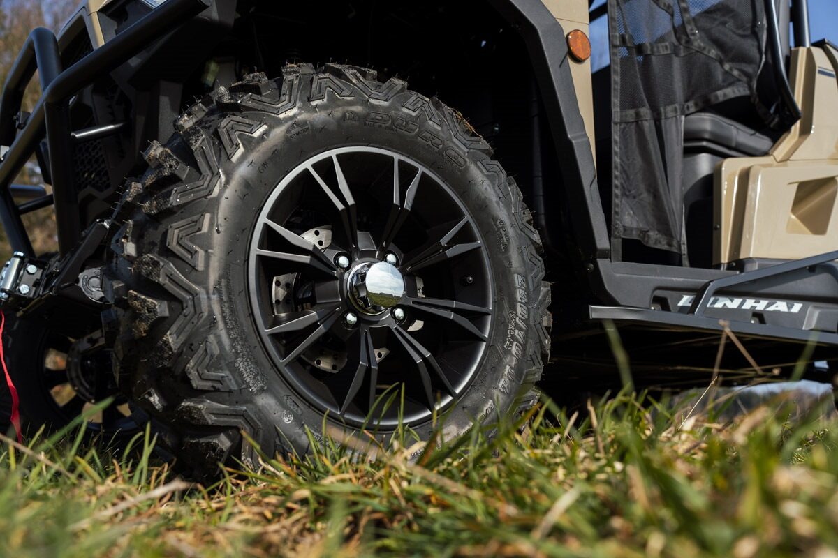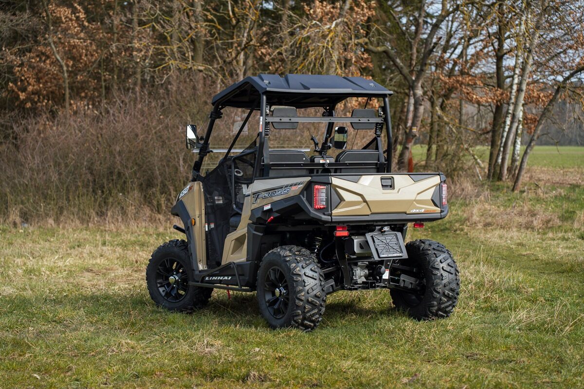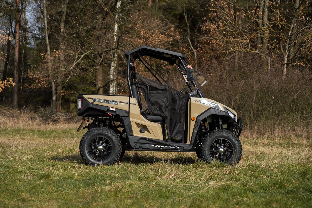 Pracovní UTV E5, kapalinou chlazený jednoválec, automatická převodovka CVTech, L/H/N/R/P, pohon 2x4 / 4x4 elektricky přepínatelný, elektrický posilovač řízení EPS, sklápěcí korba, zavěšení: nezávislá dvojitá A-ramena vpředu i vzadu, 4x hydraulická kotoučová brzda, tažné zařízení, přední ochranný rám, el. naviják 3000 lbs s dálkovým ovládáním, LED osvětlení vzadu, ALU disky
