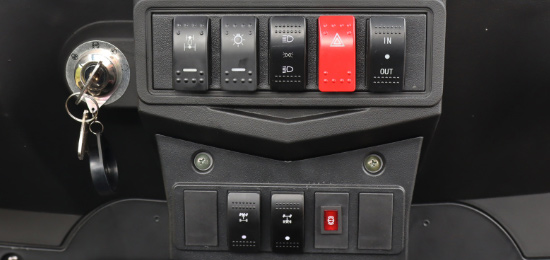 Přístrojová deska s modře podsvíceným displejem je dobře čitelná, a poskytuje všechny důležité informace. K dispozici máte digitální otáčkoměr, digitální rychloměr, ukazatel počtu najetých km, ukazatel počtu motohodin, indikátor zařazeného pohonu 2WD / 4WD, ukazatel teploty chladící kapaliny, digitální palivoměr, kontrolka neutrálu, dálkových světel, ukazatelů směru, zařazené zpátečky a kontrolka motoru.
