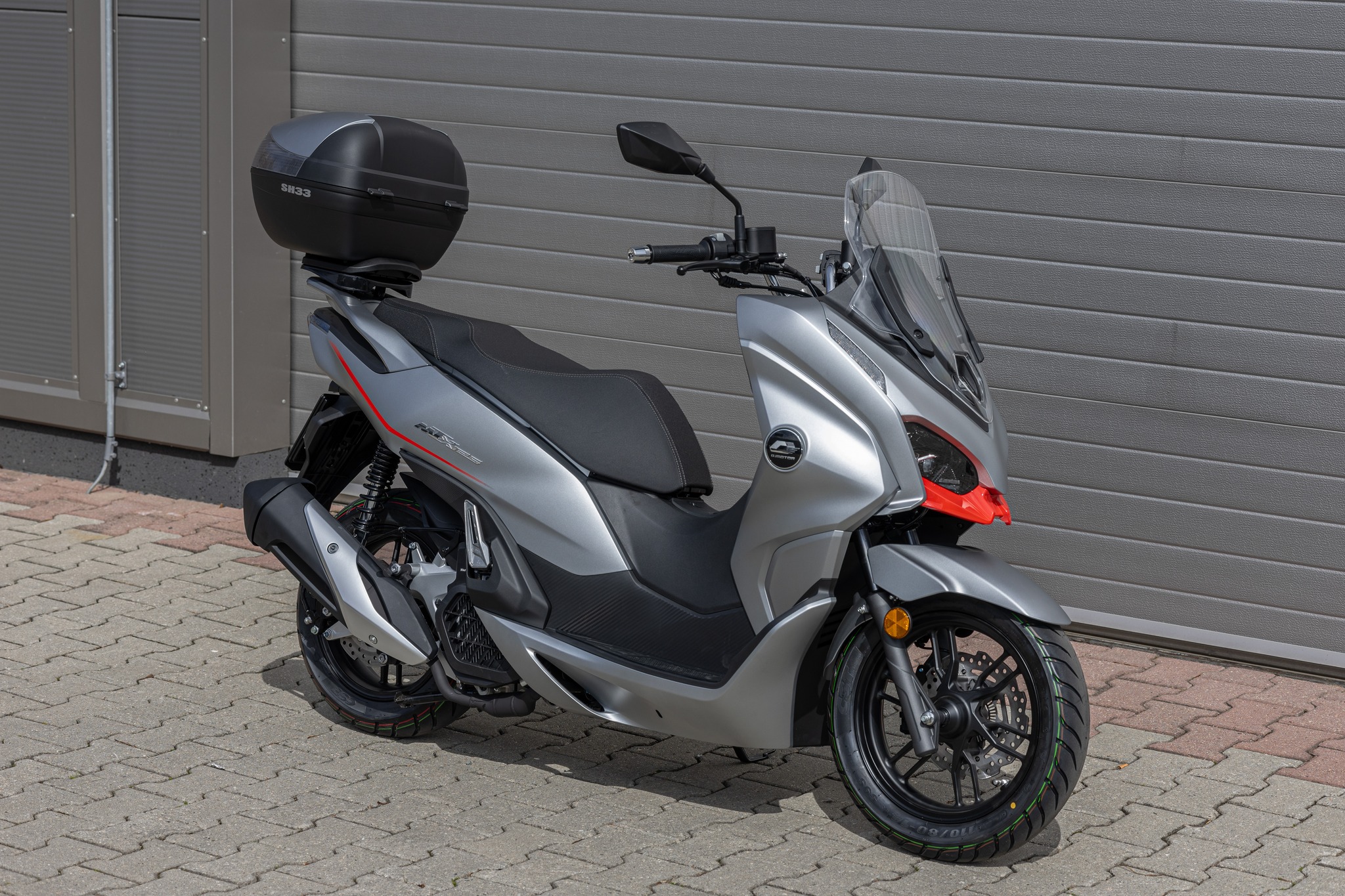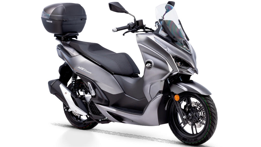 Novinka 2025 - hybridní skútr MTX 125 je doslova prošpikovaný moderními a pokročilými technologiemi. Ne každý skútr osloví širokou veřejnost jako naše novinka MTX 125 a dost možná dostane i Vás, protože již v základu má opravdu hodně co nabídnout: Pohonná jednotka se skládá z klasického spalovacího motoru a elektromotoru (startér - generátor) který pomáhá dosáhnout opravdu parádní zrychlení. Díky této technologii umí MTX 125 jezdit se spotřebou okolo 2,3 litru na 100 km. Dále má již v základu start / stop systém, vypínatelnou kontrolu trakce, dvoukanálové ABS, bezklíčkové zapalování, barevný TFT panel s konektivitou, zrcadlením a navigací. Monitorování tlaku a teploty v pneumatikách je i u tohoto skútru standardem. Přidejte barevně sladěný horní kufr, dvě USB zásuvky, LED osvětlení, modře podsvícené ovladače v základní výbavě a máte tu opravdu královsky vybavený stroj.