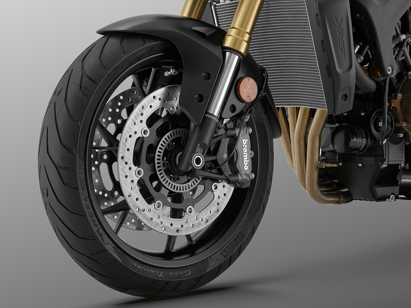 Opravdu výkonný brzdový systém SRK 800 je vybavený dvouokruhovým systémem ABS a kotoučovými brzdami BREMBO s kotouči o velkém průměru vpředu i vzadu. Nabízí bezpečné zastavení v každé jízdní situaci, ať už na silnici a nebo na závodním okruhu. Přední dvoukotoučová brzda s kotouči o průměru 320 mm a s radiálně uloženými čtyřpístkovými brzdovými třmeny a radiální brzdovou pumpou zajišťují silnou, avšak přesně dávkovanou brzdnou sílu. To vše skvěle doplňuje zadní brzda s kotoučem o průměru 260 mm a s dvoupístkovým třmenem.