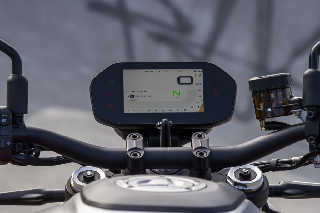 Digitální přístrojová deska SRK 800 je vizuálním a technickým srdcem kokpitu. Tento velký barevný TFT displej zobrazuje velké množství informací, je snadno čitelný ve dne i v noci a umožňuje Vám snadno upravit si motocykl přesně pro sebe. Kromě toho má schopnost propojit se s mobilním telefonem jezdce, s možností zobrazení navigace, která zobrazuje i aktuální provoz, nebo také umožňuje zrcadlit obrazovku Vašeho mobilního telefonu. Dále přístrojový panel umožňuje spravovat a prohlížet si příchozí hovory.