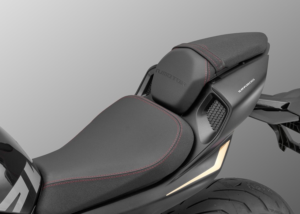 Dvoudílná sedadla s krásně červeně prošívaným sedadlem řidiče i spolujezdce nabízí velký jízdní komfort i na delších výletech. Jeho jedinečný design a autentický minimalistický styl podsedlovky dodává SRK 800 ten správný šmrc.