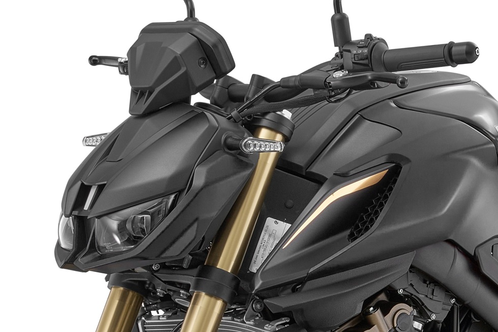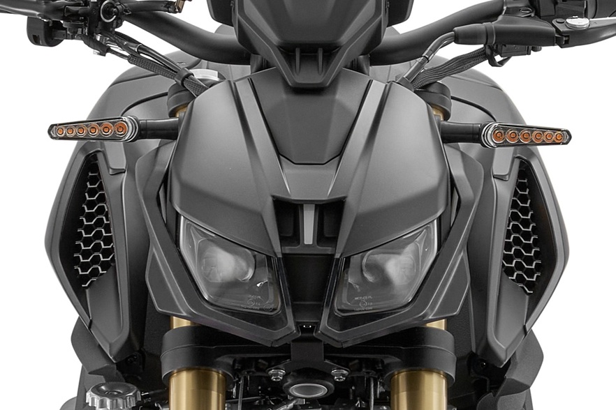 SRK 800 má z výroby krásné šesti-diodové blinkry, které svým designem dokonale pasují k tomuto sportovnímu motocyklu. Navíc už v sériové výbavě mají sekvenční, nebo chcete-li animovaný průběh blikání, což je oblíbená vychytávka moderních motocyklů i automobilů.