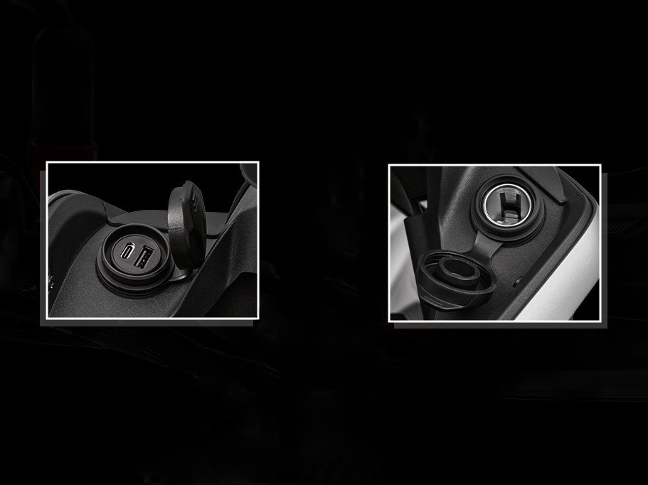 V kokpitu je vedle TFT panelu po obou stranách integrována zdvojená zásuvka USB A a USB C (nalevo) a klasická 12V zásuvka (napravo) . Můžete skrz ně nabíjet například mobilní telefon, nebo si též zapojit navigaci. USB i 12V zásuvka má samozřejmě voděodolnou gumovou krytku.
