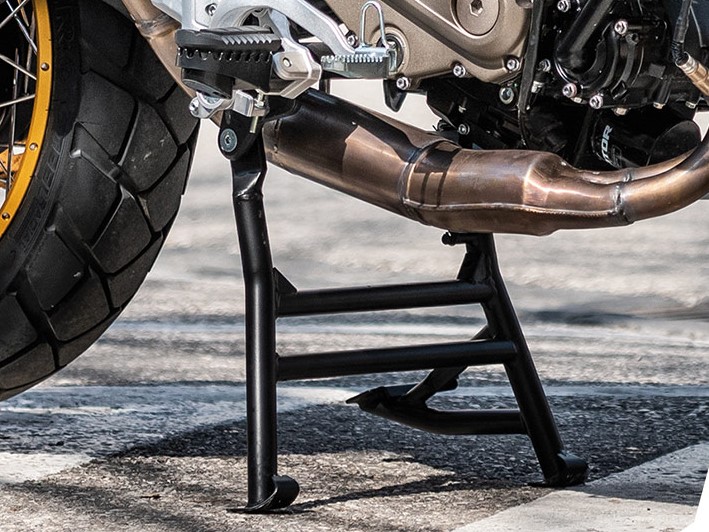 Kromě bočního stojánku je SRT 700 X vybaven také robustním hlavním stojanem. To nabízí bezpečnější parkování motocyklu, zejména na nezpevněném povrchu a též usnadní údržbu stroje.