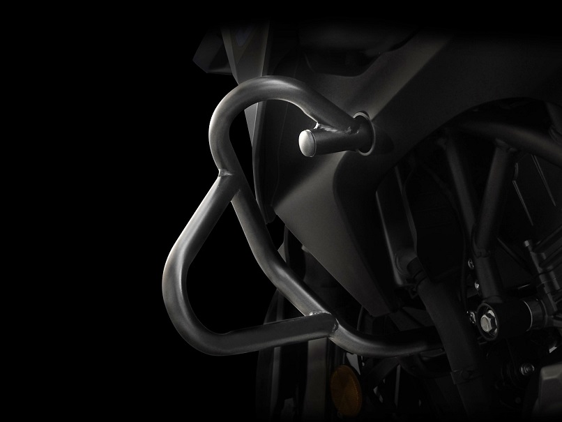 Kvalitní, velmi odolný padací rám umístěný okolo motoru je namontován na zesílených závěsných bodech na hlavním rámu motocyklu a chrání tak motor a části kapotáže v případě nechtěného pádu motocyklu na bok.