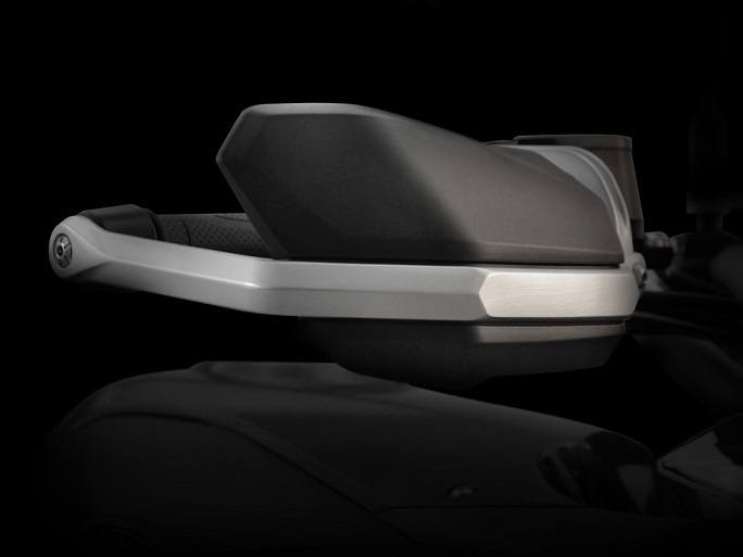 Robustní chrániče rukou s hliníkovými držáky a plastovými skořepinami odvádějí vítr od jezdcových rukou a nabízejí dodatečnou ochranu řídítek a páček v případě nechtěného pádu.