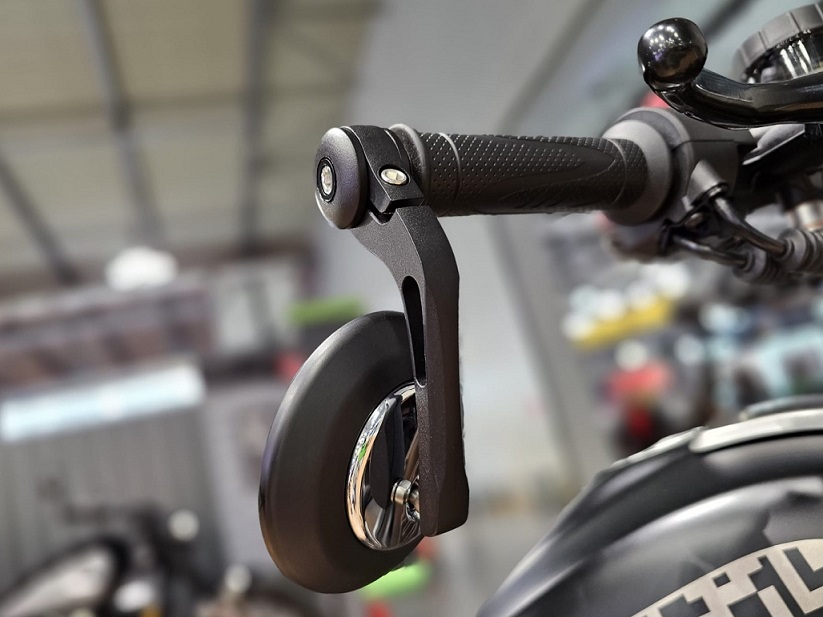 Zrcátka jdou kompletně otočit dolů pod řídítka. Tato rebelská pozice je u nás stále poměrně neobvyklá a zaujme hodně netradičním vzhledem ve stylu Cafe Racerů, ale má i své praktické výhody. Ty ocení především mohutnější jezdci, kteří v zrcátkách v klasické pozici nahoře nejčastěji sledují svá vlastní ramena.