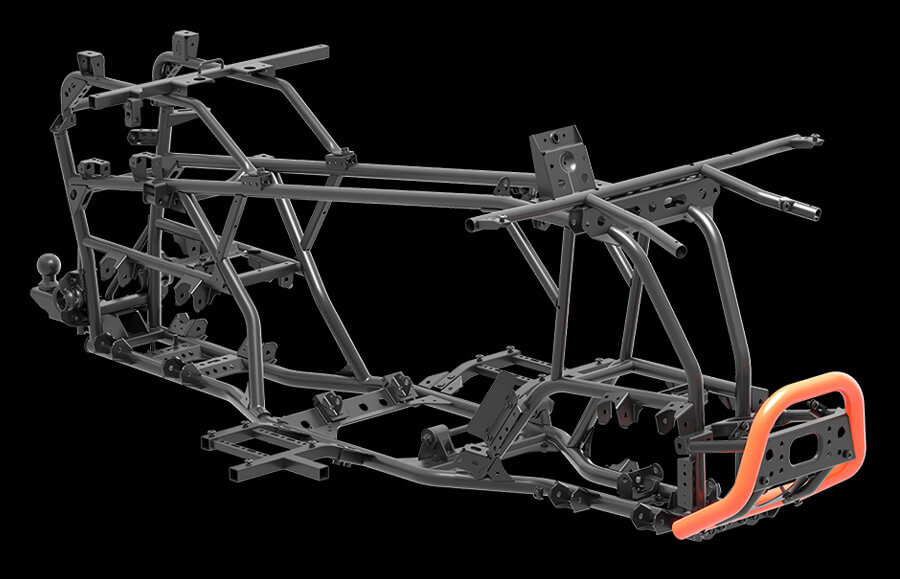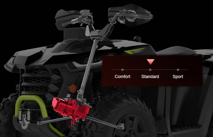 Elektrický posilovač řízení s variabilním účinkem, elektrický naviják, sedadlo spolujezdce s opěrkou zad, homologované tažné zařízení, kompozitní nosiče vpředu i vzadu, uzávěrka předního diferenciálu, digitální multifunkční displej, Full-LED osvětlení, přední ochranný rám, 12" hliníkové disky, 25" pneumatiky, hydraulické tlumiče s progresivními pružinami, nastavitelné předpětí pružin, ochranné kryty rukojetí, zpětná zrcátka