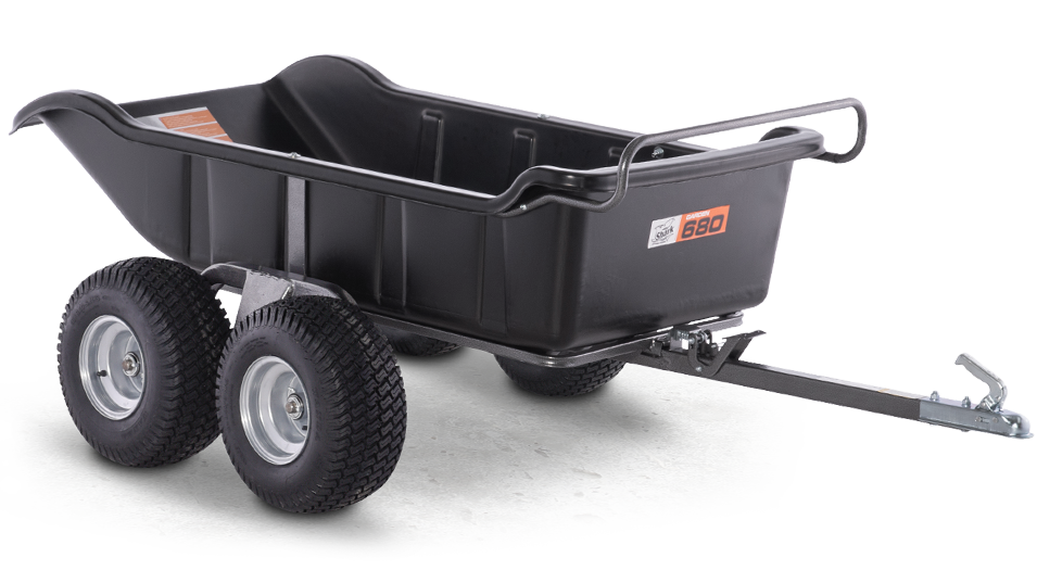 Robustní čtyřkolový vozík s výkyvně uloženými nápravami, velká sklápěcí plastová korba, práškově lakovaná konstrukce, široké nízkotlaké pneumatiky šetrné k povrchu.