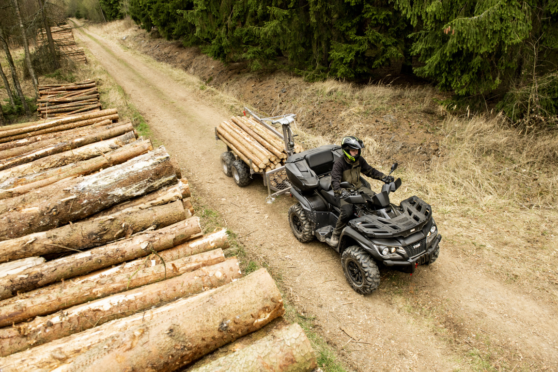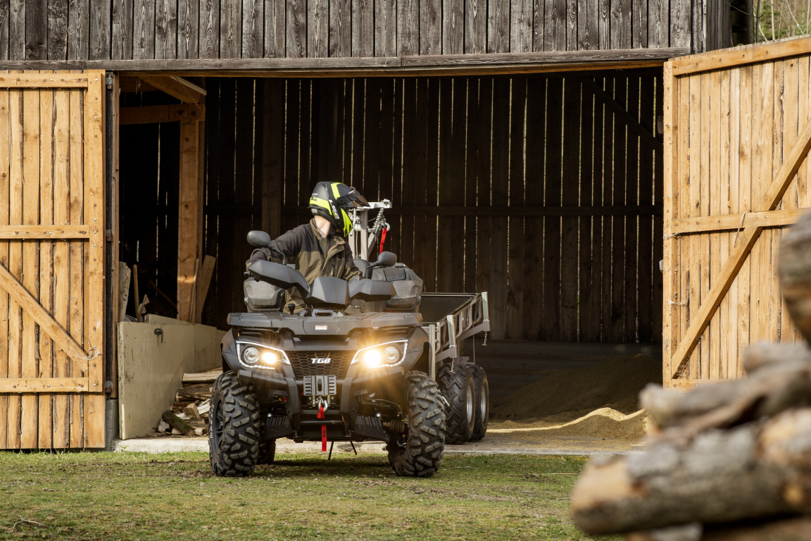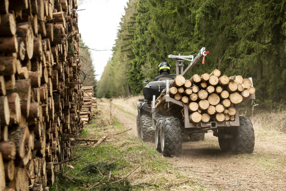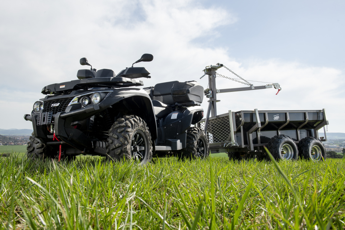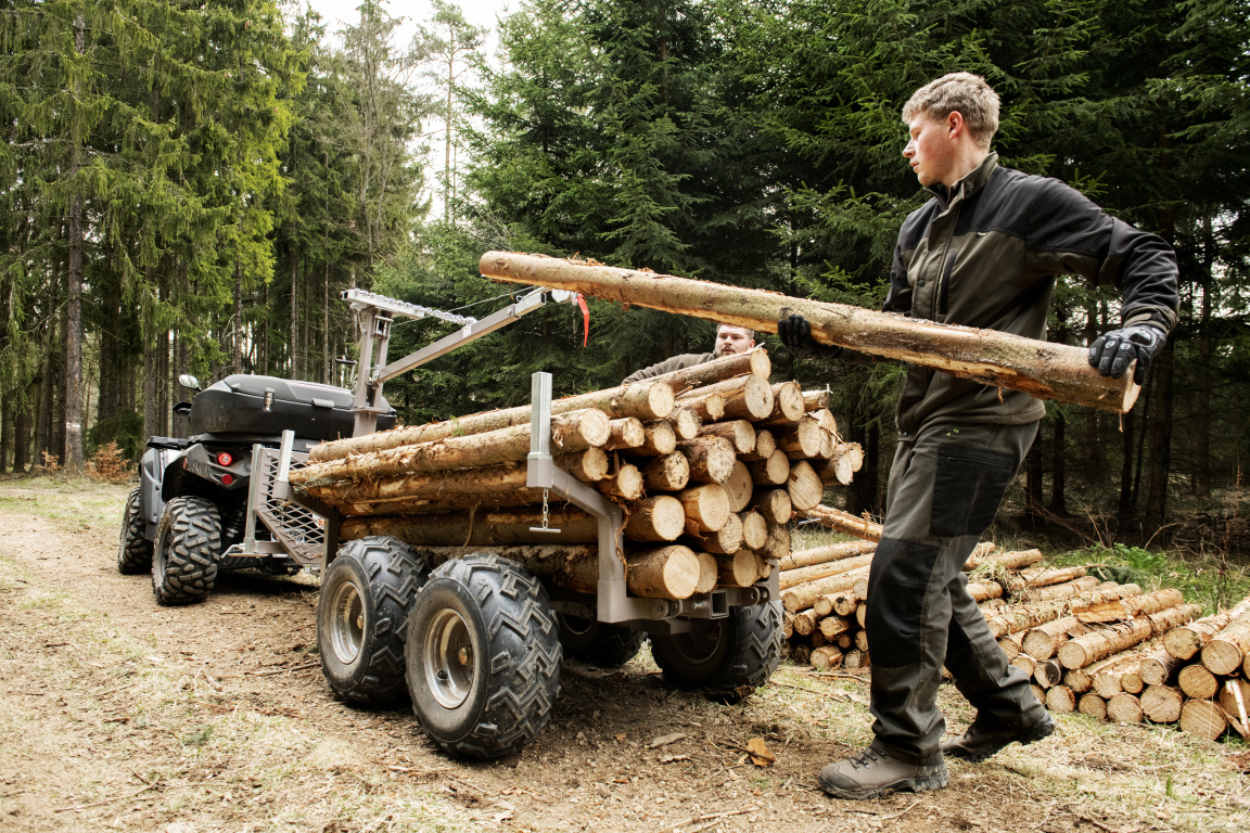 Velkokapacitní profesionální dvounápravový přívěs s nakládacím jeřábem a výkyvně uloženými nápravami, vysoká nosnost 1400kg, odnímatelná korba, odnímatelná čela, robustní pozinkovaná a práškově lakovaná konstrukce, nízkotlaké terénní pneumatiky. V ceně jsou i 2 páry klanic.