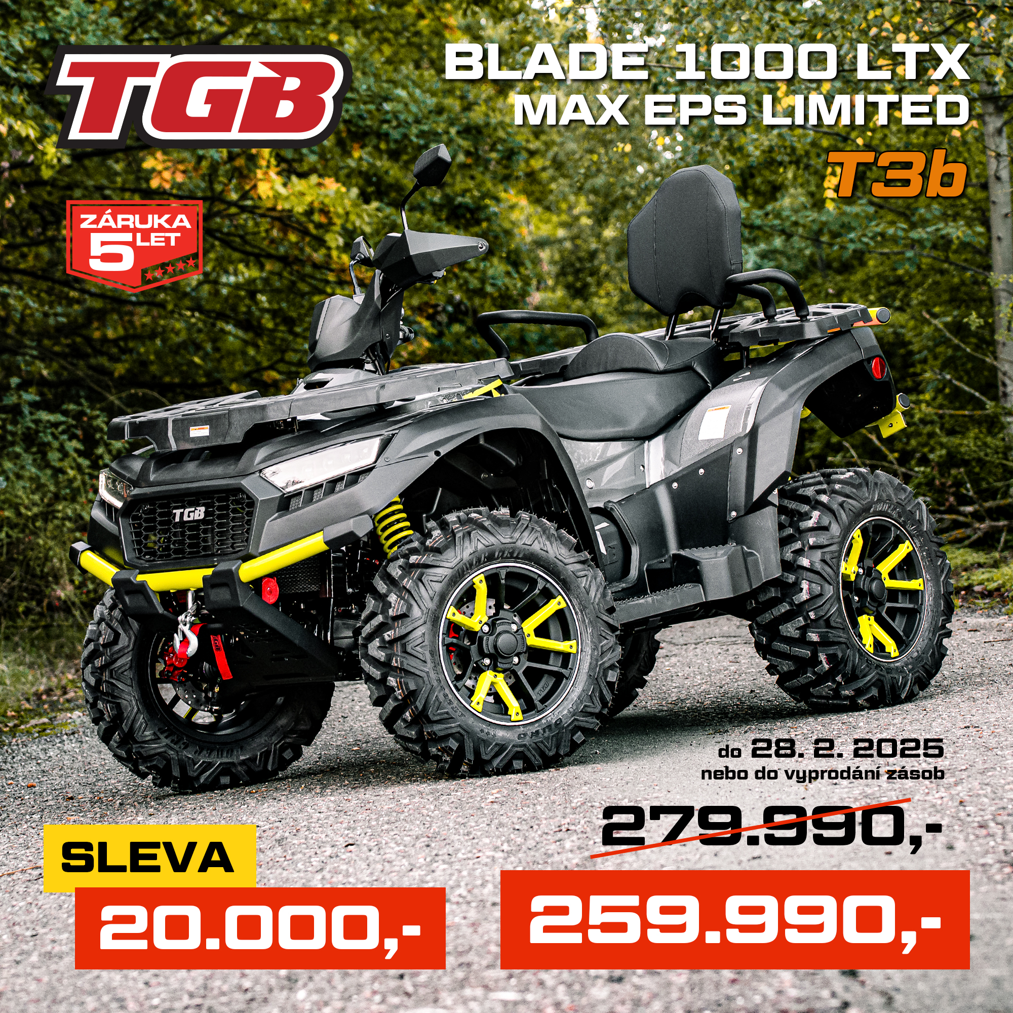 Špičkový Blade 1000 LTX MAX EPS LIMITED je vybavený originálním továrním zadním nárazníkem TGB ve svítivě žluté barvě. Velký barevný TFT displej s denním a nočním režimem, který navíc nově disponuje i Bluetooth připojením k mobilnímu telefonu. Pozornost upoutají LED zadní světla s dynamickou funkcí blikačů. Výkon této vydařené čtyřkolce dodává vůbec nejsilnější motor značky TGB, a samozřejmě nechybí nic z toho, co dělá Blada 1000 LTX tak oblíbeným: pohon 2x4/4x4 s uzamykatelnými diferenciály, zesílená automatická převodovka s japonskými komponenty, posilovač řízení s variabilním účinkem, prodloužený podvozek s dostatkem místa pro dva a tažné zařízení. Vydařený vzhled nového modelu podtrhují LED-Matrixové světlomety a atraktivní kola s barevně odlišenými segmenty.